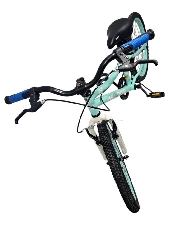 Bicicleta de montaña diseñada para niños con un cuadro de color verde menta, Frenos de manillar, transmision de 1 a 1, pequeños detalles en la pintura, asiento generico.