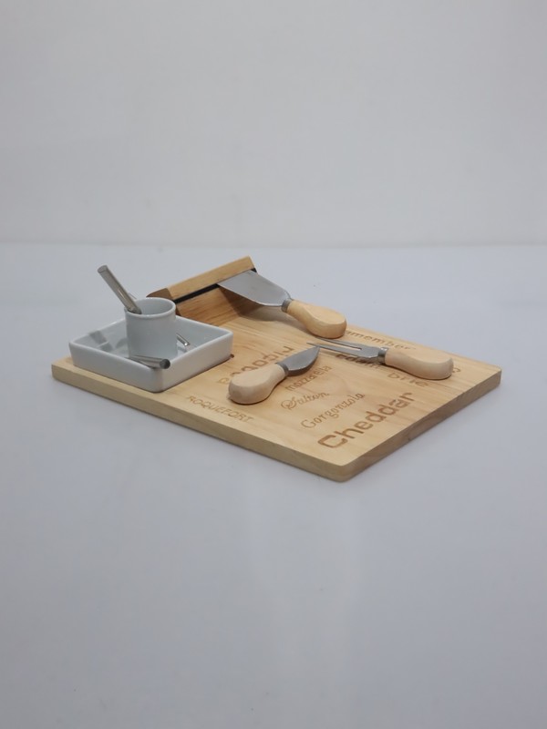 Incluye una tabla de bambú y varias herramientas de acero inoxidable con mangos de madera.