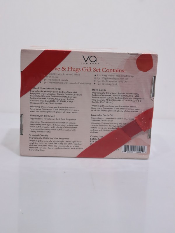 Incluye vaso con pajita, vela perfumada, jabón artesanal de nuez, sal de baño, aceite corporal.